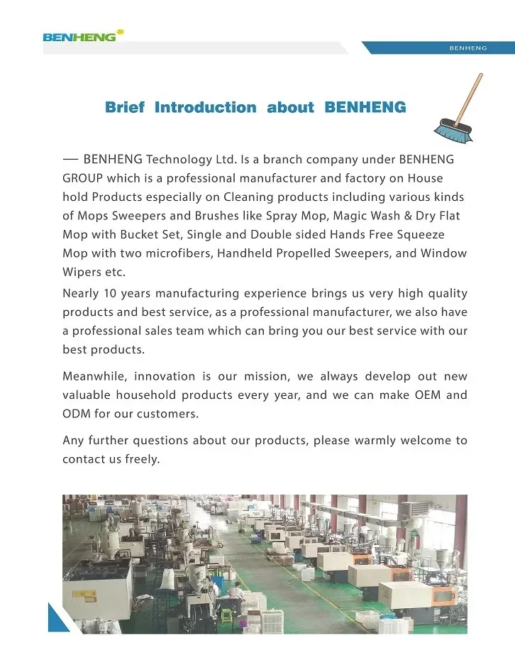 Customization optionsCustomized logo (Min. order: 1,000 pieces) Customized packaging (Min. order: 1,000 pieces) Graphic customization (Min. order: 1,000 pieces) View details Product Description ![]() ![]() ![]() ![]() Specification Packing & Delivery Individual packing with an color box Company Profile BENHENG is a professional manufacturer for 10 Years on Household cleaning products like Vacuum Cleaners, Mops, Magic Flat Mop with Wash & Squeeze Dry Bucket, Sweepers, Brushes, Mop Holder, Dustpan and Brushes etc.