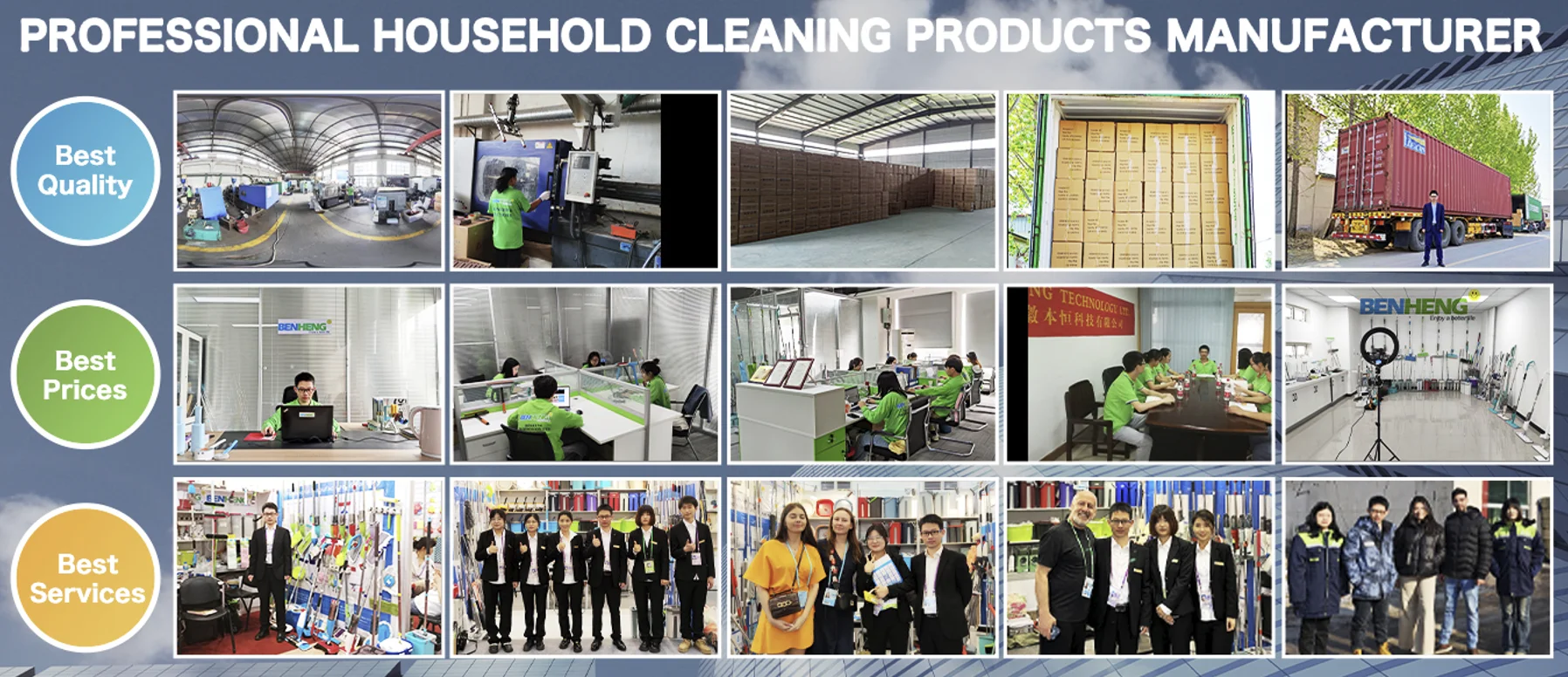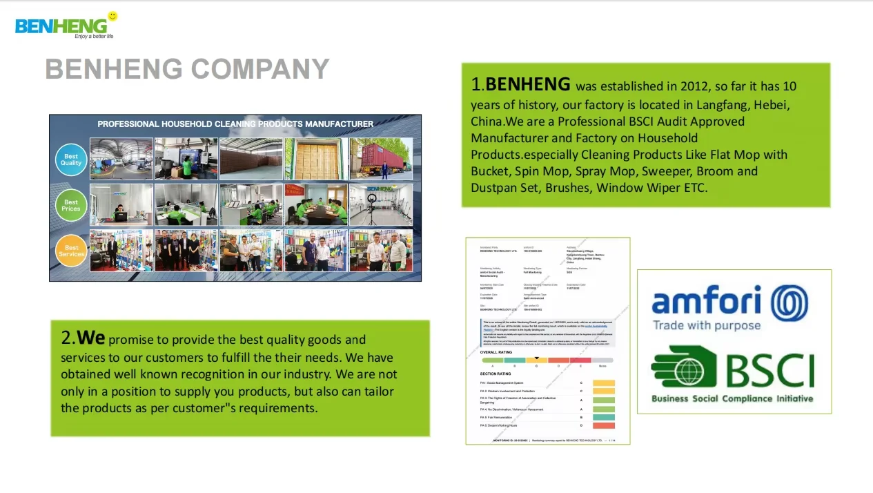 Always final Inspection before shipment; 3.what can you buy from us? We BENHENG are a professional manufacturer on household products, especially cleaning products like various kinds of Mop, Broom and dustpan, Brushes, Window Wipers etc. for many years. 4. why should you buy from us not from other suppliers? BENHENG TECHNOLOGY LTD. is a member of BENHENG GROUP which is a Professional Manufacturer and Factory on household products, especially on cleaning products including Mop, Broom, Brushes, Window Wiper, Kitchen Items, Storage items, Vacuum Cleaner etc. 5. what services can we provide? Accepted Delivery Terms: FOB,CIF,EXW